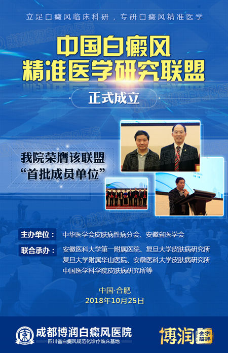 在此科研合作项目基础上,为响应国家大力倡导精准医学,进一步落实提升白癜风医疗质量管理的科学化、专业化和精细化水平,10月26日,“中国白癜风精准医学研究联盟”于合肥正式成立!